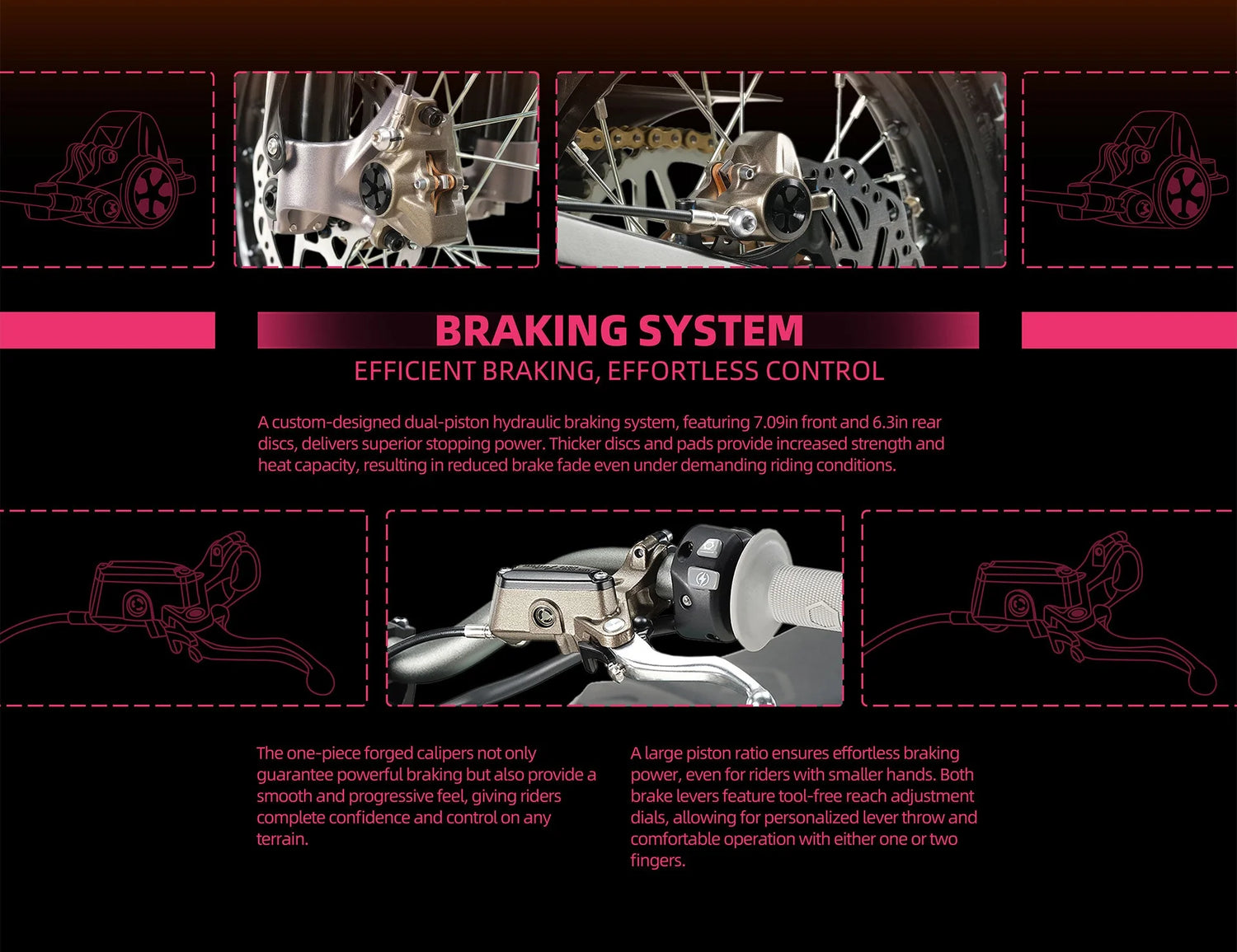 Equipped with a custom dual-piston hydraulic setup and oversized rotors, this system delivers strong, fade-resistant stopping power. Designed for confident control with smooth lever feel and tool-free adjustability.